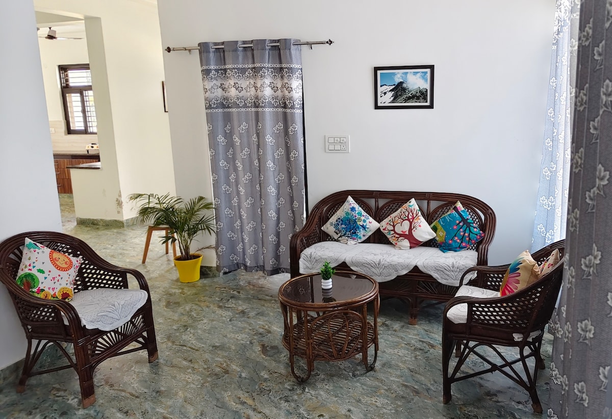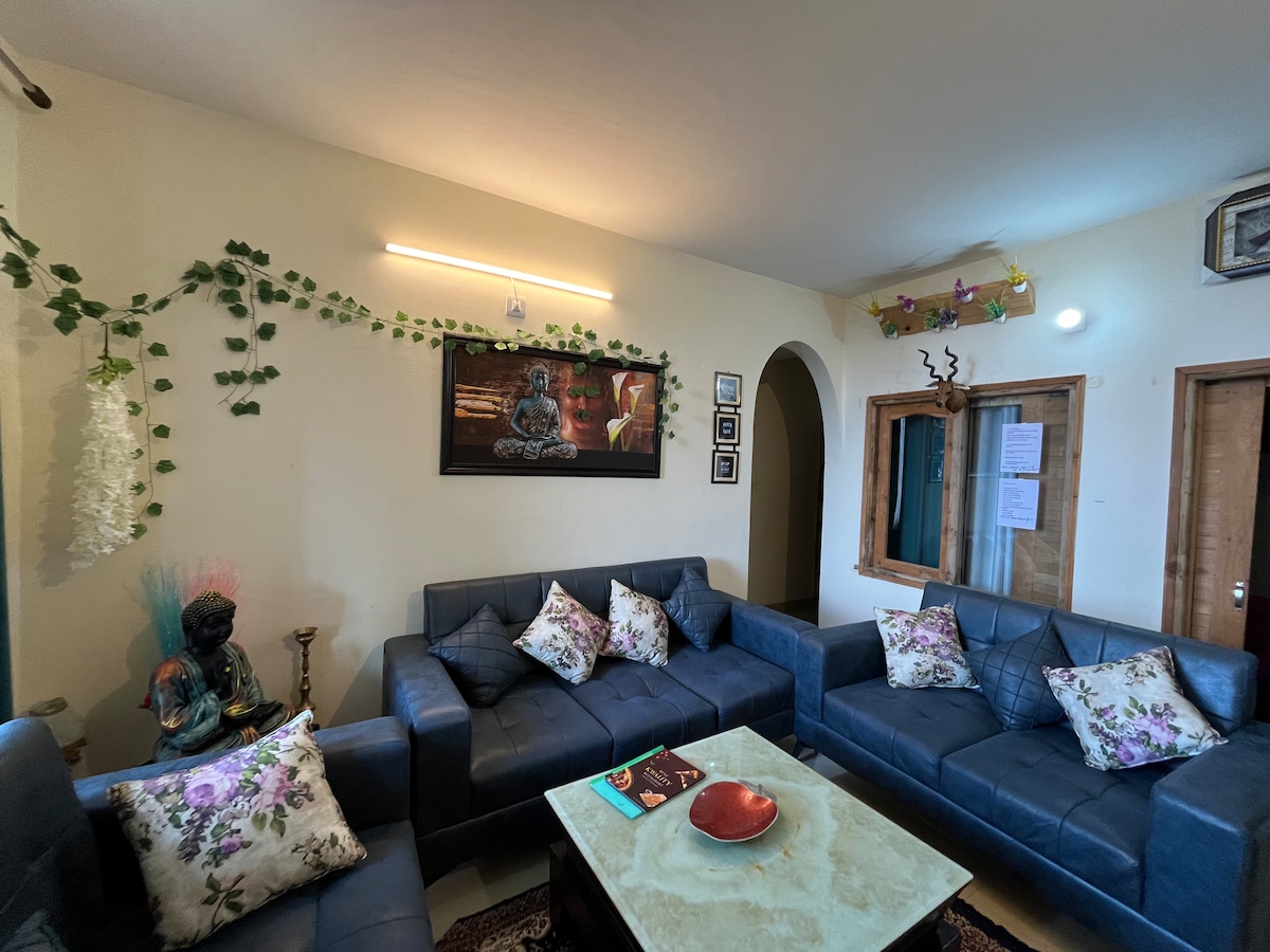 We welcome you to our serene top-floor retreat featuring 3 cozy bedrooms: 2 with wooden decor, 3rd one is a small size attic loft bedroom with attached living area. A shared balcony between the 2 bedrooms provides access to 2 washrooms. Enjoy ~80Mbps Wi-Fi, a 32" Smart TV, WFH desk, mini kitchen, power backup, and free indoor parking, next to local cafes. Thoughtfully maintained by a caretaker, cleaning aunty.