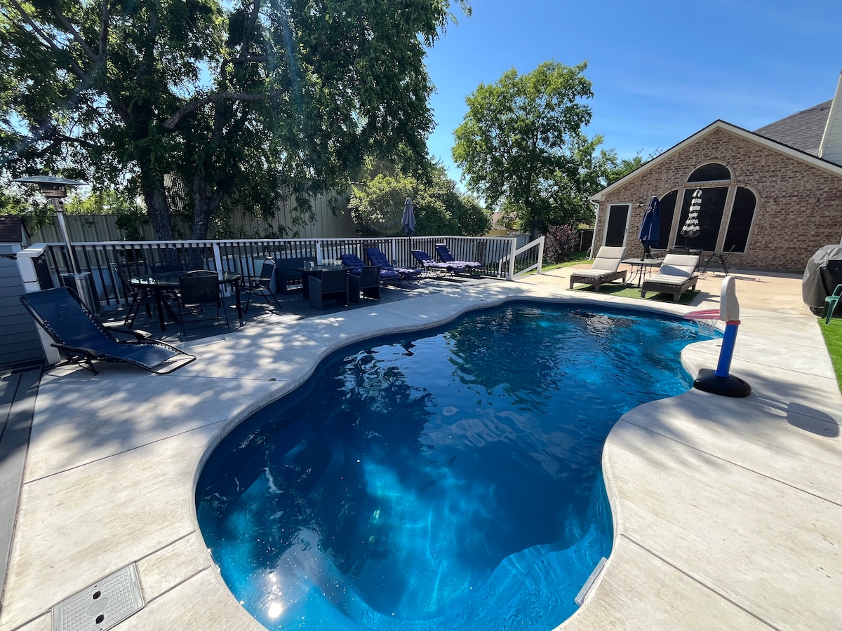 You will love the comfort and quiet of this beautiful home! This house offers a shallow in-ground pool, a bubbly inflatable hot tub, a 5-course mini golf area, smart TVs in all bedrooms, an outside grill, smoker, hammocks, complimentary shampoo, conditioner, body wash, coffee, tea, Xbox One, a poker table, a pool table, kayaks, board games, and more! This house is in a cul-de-sac, near Lake Ray Hubbard, and downtown Dallas. Discounts for weekly and monthly stays!