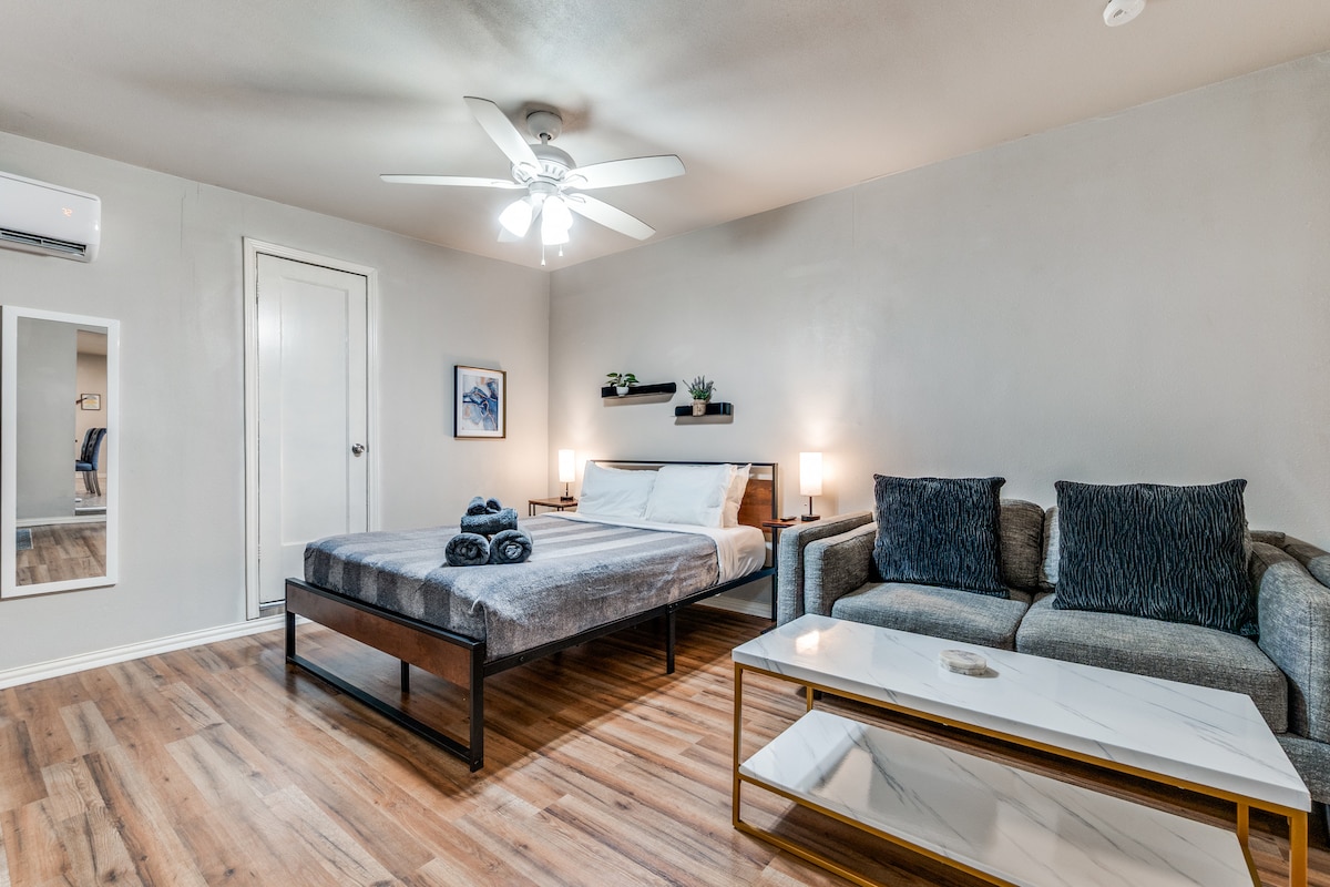 Private, comfortable, cute 450 sq ft studio with a plush queen bed, queen sleeper-sofa, well-equipped kitchenette (single burner hot plate and mini fridge), lounge area, dining area/workspace, and separate garden space with a picnic table. It has a full bathroom with a closet equipped with plenty of hangers. It is a perfect home-base for enjoying a beautiful neighborhood highlighted by White Rock Lake, The Dallas Arboretum, and easy access to Downtown, Uptown, and Deep Ellum.