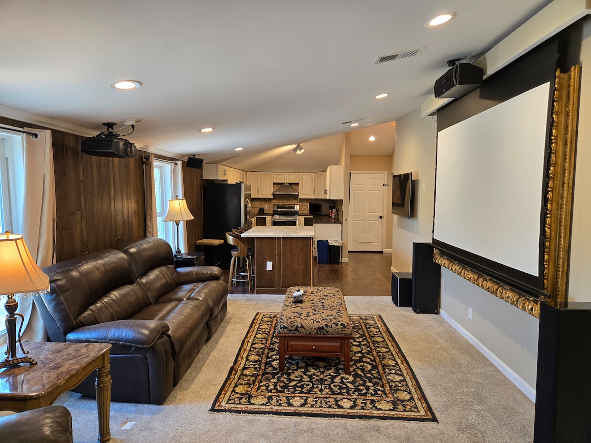 Indulge in a luxury retreat designed for comfort and style. The king suite boasts a wall mural, private balcony, and walk-in closet, while the spa-inspired bath offers a Toto bidet and tile glass shower with multiple heads. Entertain in the custom theater with 100” screen, 4K projector, and surround sound, or work in the executive office with 32” curved monitor. A chef’s kitchen is fully stocked for gourmet meals, with private entry and garage parking included. There may be some dog hair present
