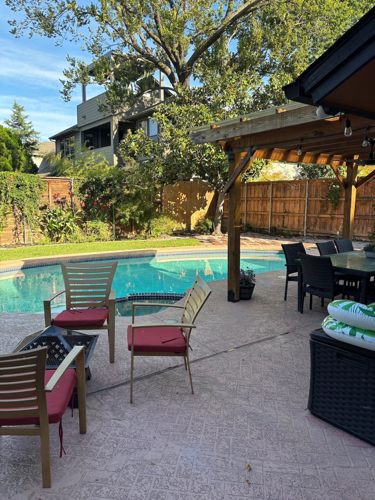 Welcome to our stunning retreat near Bishop Arts in Dallas! This exceptional house is the perfect sanctuary for your dream getaway, offering luxurious amenities, including a pool and hot tub, all within a prime location. As you step inside, the open-concept living area is bathed in natural light, creating a warm and inviting atmosphere. Step outside into your own private paradise. The backyard is a haven for relaxation and entertainment - featuring a massive covered deck and a pool/hot tub.