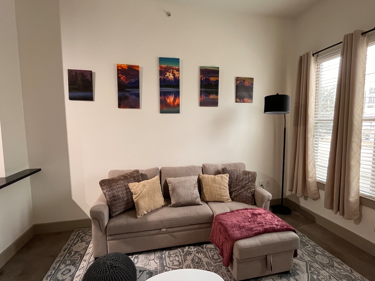 Discover elevated comfort in our 2-story loft condo, where a bright, airy interior meets high-end design. Perfect for work or leisure, the space features a dedicated workspace, plush seating, and top-notch amenities: high-speed Wi-Fi, a fully stocked kitchen, washer/dryer, and a 65-inch smart TV. Step outside to enjoy the award-winning courtyard with its pool, fountains, fire pit, and outdoor kitchen. Located in the heart of Dallas, you’re within walking distance to Starbucks & Whole Foods.