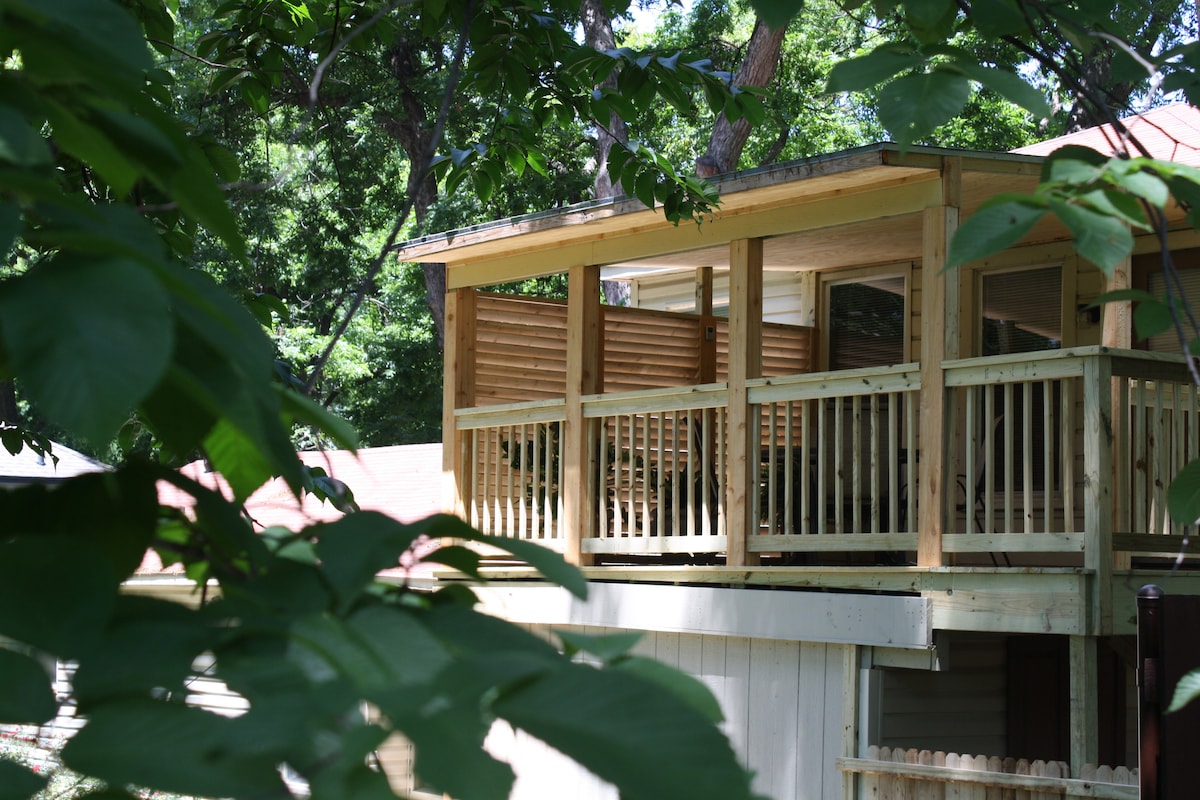 Welcome to your World Cup Home Base! Five miles from Fan Fest and seven miles from IBC! Does relaxing on a peaceful patio in the trees sound good? Escape the bustle of Dallas to your own private upstairs, fully-equipped efficiency located in a garden setting! Includes queen bed, full bath, full kitchen, fast WiFi, TV Netflix/Amazon Prime and MORE! NO CLEANING FEE and no CHECK OUT CHECKLIST! Check out our discounted weekly/monthly rates! Country in the Heart of the City!