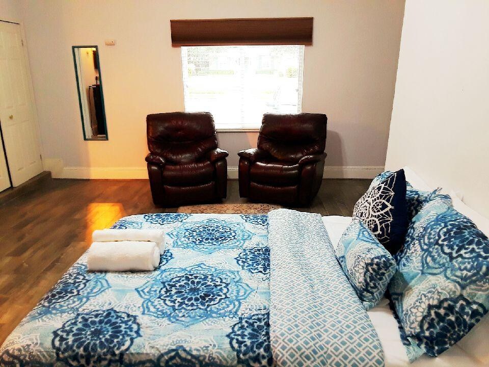 Kick back and relax in this calm, stylish space, Private room with private bathroom and kitchen, private entrance with smart lock. This is a garage converted into a room, it is similar to a hotel room where the space is used to the maximum, designed for two people, it is a cozy & practical place. It consists of a patio at the entrance where people can smoke or relax when the weather permits. have a Queen bed, space to work, 50 Inch TV, microwave , refrigerator & hair dryer