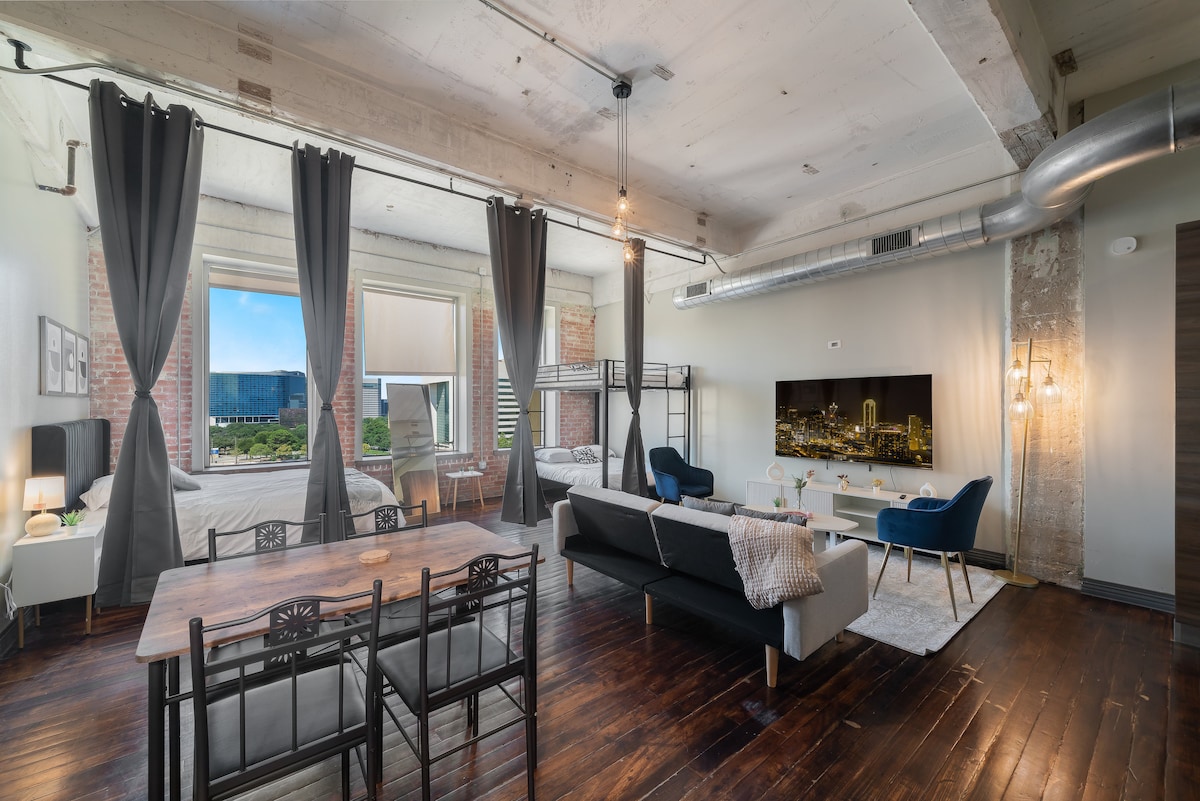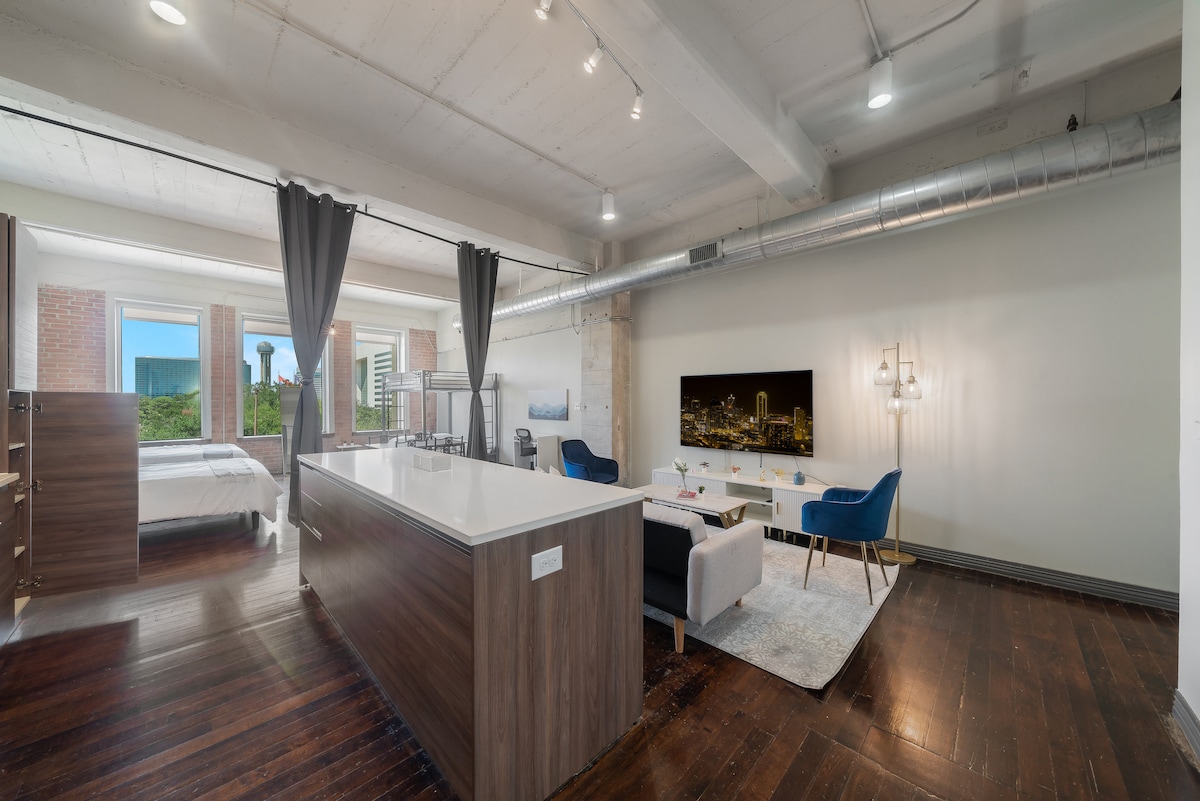 ✨ Modern Downtown Dallas Loft ✨ Stay in a cozy, modern downtown loft! This sleek 2-bedroom retreat offers contemporary style and unbeatable convenience — perfect for business trips, family getaways, or group stays. ✅ 5-min walk to Kay Bailey Hutchison Convention Center ✅ Free Valet Parking (1 vehicle) ✅ Steps to Dallas World Aquarium, Reunion Tower, Deep Ellum & more Work or play — experience the best of downtown Dallas!