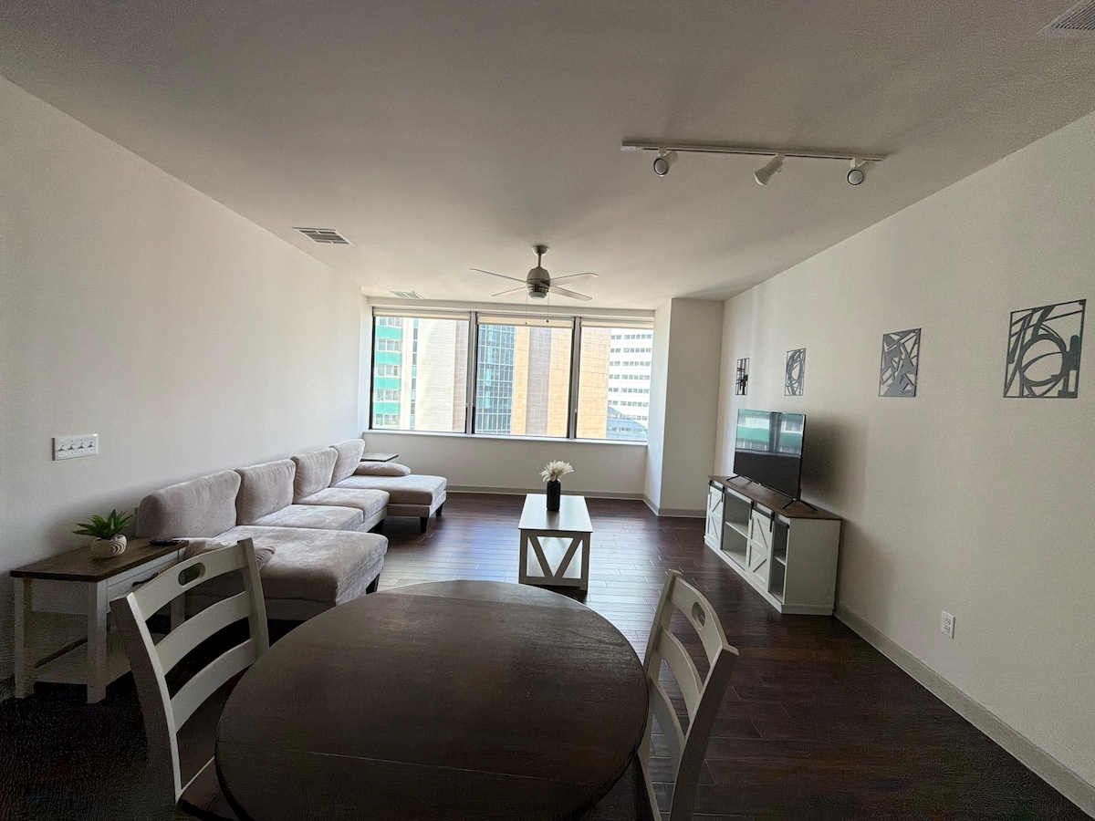 Welcome to our amazing Downtown Dallas high rise! Enjoy a stylish experience at our place in the heart of downtown. Close proximity to several restaurants and every event space. Enjoy amazing views through our floor to ceiling windows, or chill on the large balcony. Comes with free garage parking , full kitchen and all amenities a luxury apartment has to offer.
