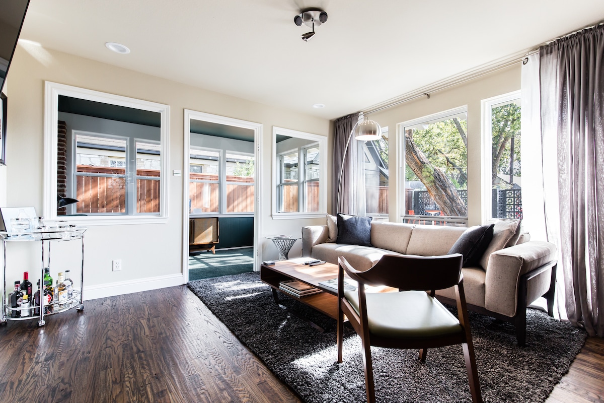 BEST REVIEWS INCREDIBLE VALUE! NOW OFFERING GROCERY CONCIERGE SERVICE! Live like the "Rat Pack" did in Palm Springs. Close to Everything. Great Amenities incl. beds for 8, Full Bar, Outdoor Patio with Glass Fire Pit, Indoor Glass Fireplace, Vinyl Stereo Record player and Full kitchen and Laundry. Blocks from the Dallas DART (Love Field). Uber to Downtown, Uptown, and Knox/Henderson for less than $10. Entertainment: full cable, Pandora, Netflix, Amazon Prime, and Full High Speed Wifi.
