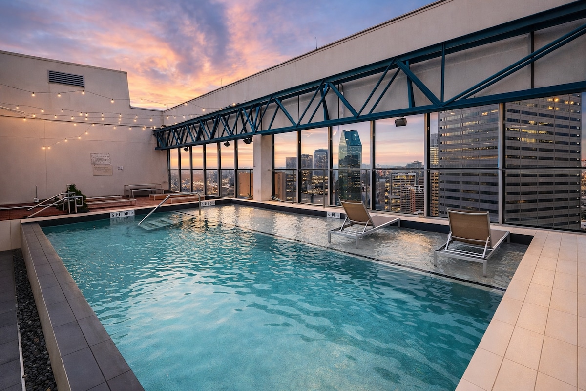 Enjoy a stylish experience with Downtown high-rise Views, close to all entertainment, restaurants, convention center, beauty centers, shopping areas and offices Public transportation, Uber/Lyft are highly available Access to gym, pool (may or may not be open) & outdoor spaces Balcony in the unit where you can enjoy yourself at any time of the day Parking garage in the building for free.