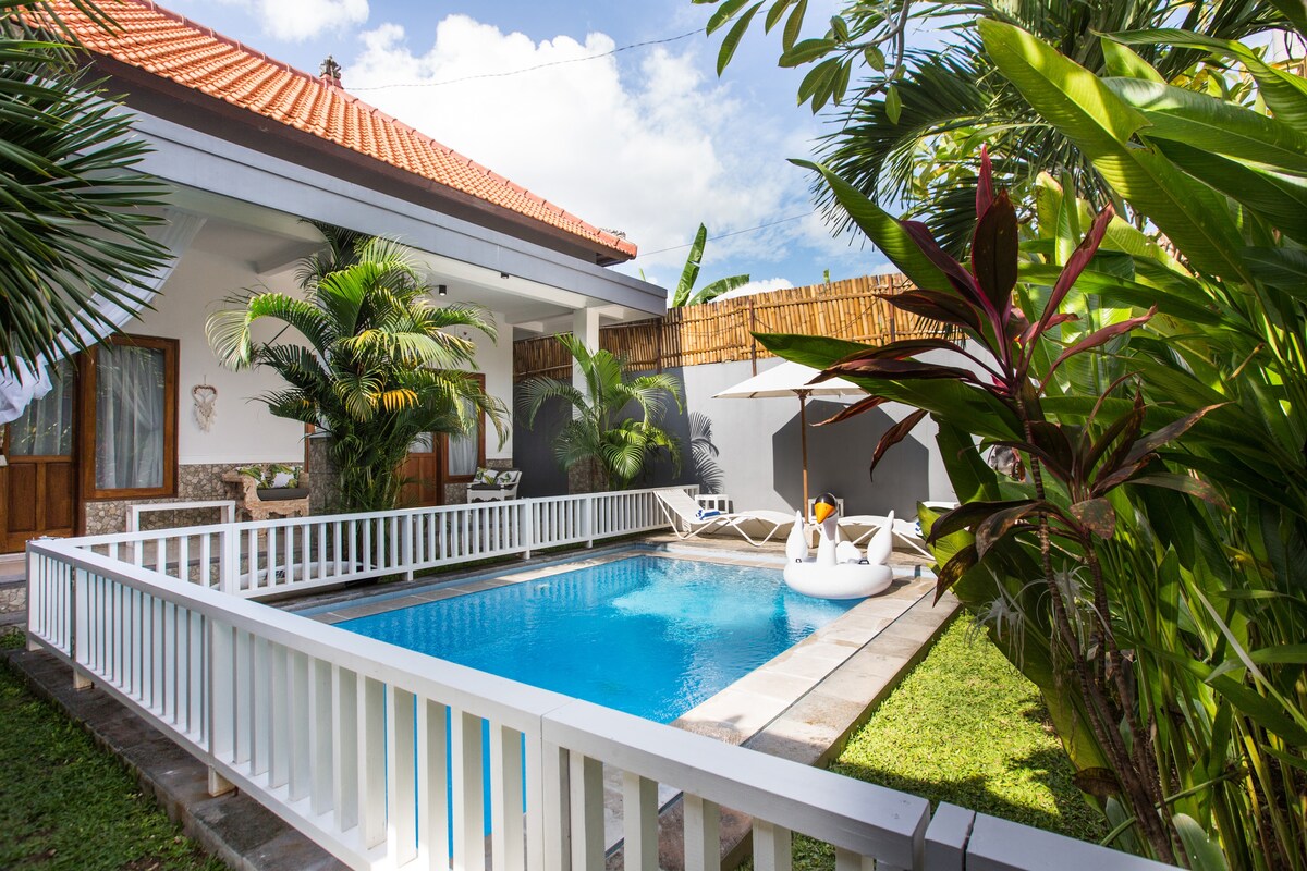 Enjoy a calm, tropical hideaway in the heart of Seminyak—perfect for families, couples, or friends. Spend your mornings on a stylish wicker lounger, soak up the sun on the deck, and cool off in your private pool, all tucked inside lush gardens just steps from Seminyak’s best spots. Strategic location (walkable): -1 min to Eat Street -4 mins to Sisterfields Café -5 mins to Seminyak Village Mall -7 mins to La Favela -10 mins to Petitenget Beach