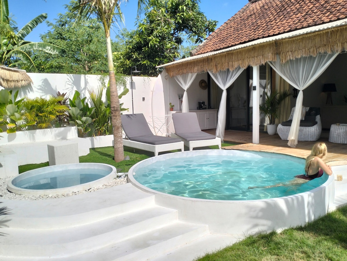 Balibay 1 — Brand New Designer Villa • 2 spacious air-conditioned bedrooms with elegant en-suite bathrooms — both with bathtubs • Large private swimming pool & BBQ area • Fully equipped modern kitchen for cooking & dining • Open-plan living & dining area with natural light and chic décor • 300 Mbps Wi-Fi for work & streaming • Netflix & PS5 on request • Baby cot & high chair on request • Daily cleaning with fresh towels & linens • Concierge service for scooter rental, drivers, massages & more