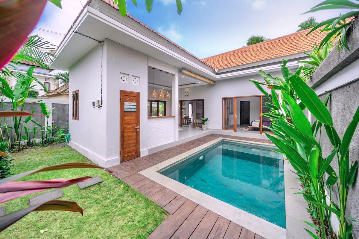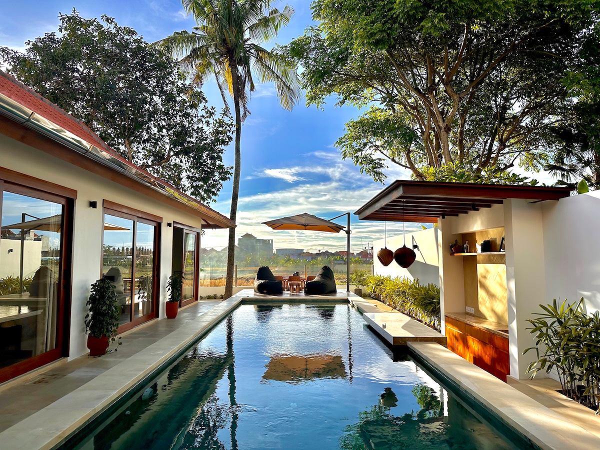 Escape to our Brand New 1 BR villa with private pool in superb location in the heart of Canggu, This is the perfect villa for couples or solo travelers who loves to explore famous spot in Canggu. Just 3-5 walk to great Restaurant, Shop, Gym, CoWorking, Pilates, cafes & Bars. It is just few minutes from famous beaches like Nelayan, Batu Bolong, Canggu Beach, This villa features a luxurious king bed, ensuite bathroom, kitchen, pool, living room, and open living spaces to relax by the private pool
