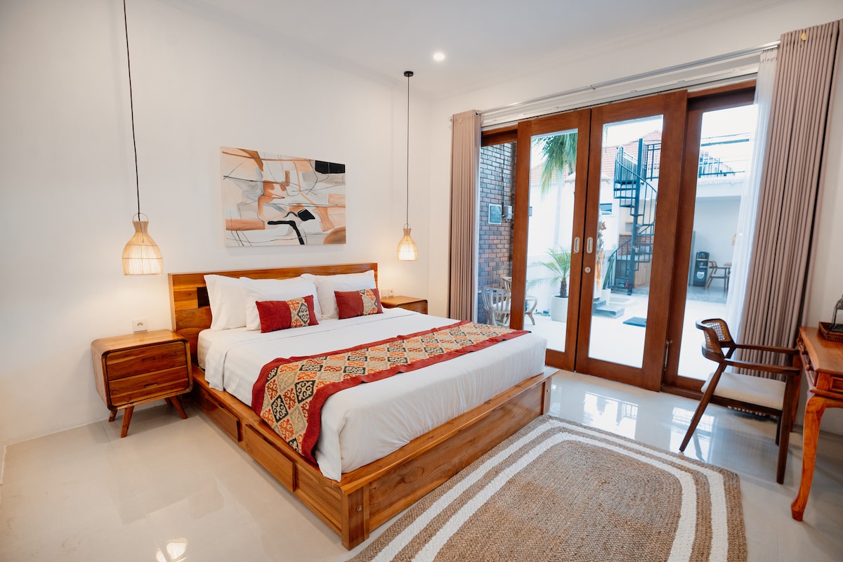 ✦ Tastefully picked and managed by BUKIT VISTA ✦ Welcome to our guesthouse in the Canggu where the cafes and beaches are just steps away. Despite being located near popular destinations, you will rest easy at night as the property is secluded from busy roads. Our guesthouse is remote working friendly as well Key Features: • Comfy double-size bed w/ AC • Private bathroom w/ hot water • Shared pool • WiFi 40Mbps & dedicated workspace • A shared kitchen