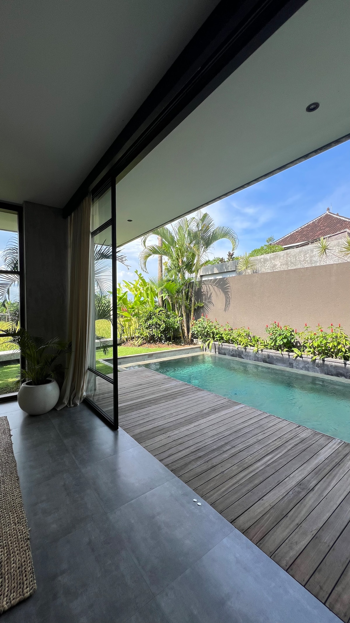 Enjoy your romantic private times in a luxurious complex, close to a fine selection of world-class cafes, restaurants and beach clubs. But perfectly hidden in a serene and quiet villa neighbourhood. This villa features an ensuite bathtub and offers a perfect dip-in pool. Enjoy your floating breakfast under the wood panels with sunlight gently pouring through. Chillax on the bean bag or sun loungers at your choice while soaking up the view of the garden.