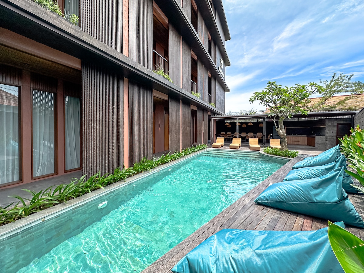 A newly built space designed with digital nomads in mind. Nestled in the Kerobokan area, the property is car-accessible and just minutes away from Canggu and Seminyak’s vibrant cafes, coworking spaces, and lifestyle spots. It blends modern comfort with traditional Indonesian wooden accents, creating a warm and inviting atmosphere. Each unit is thoughtfully crafted to support both living and working, featuring high-speed internet, cozy communal areas, and all the essentials for long-term stays.