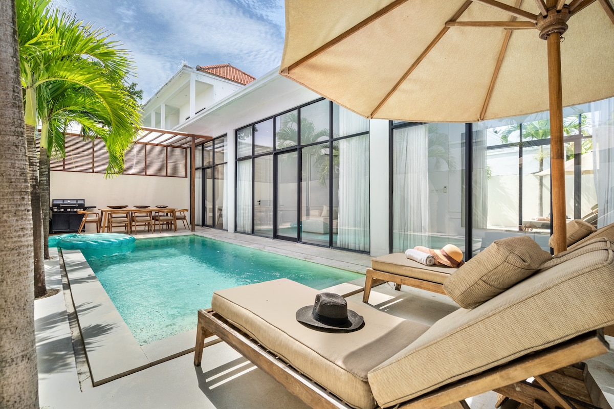 Honeymoon villa with huge pool & coconut garden. Prime location walking distance to all the restaurant & cafes in Canggu. Huge private pool & gets sun all day perfect for tanning on the terrace. Two bedrooms have king beds AC & 55" TVs + bathrooms. Living area with AC full kitchen, lounge dining & Bluetooth speaker. The staff come daily for cleaning & in-house massage table- the perfect way to relax. We are surrounded by Bali's best cafes & restaurants, Epic location at Echo Beach & Batu Bolong.