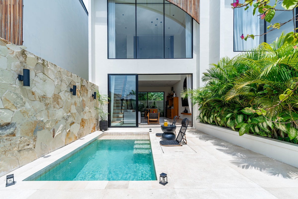 Casa Mimo is a 3 bedroom modern villa with en-suite bathrooms, located in the heart of Canggu, Bali. This villa has an enclosed living room with a cinema system and a private pool with outdoor shower. All the bedrooms, living room and kitchen are air-conditioned. Many restaurants, shops, and motorbike rentals are within walking distance. You can reach Echo Beach by 3-5 minute ride.