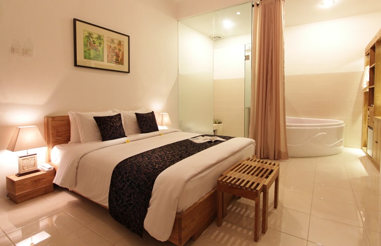 Situated within its own private villa complex. Away from the bustling crowds of downtown seminyak , These one bedroom Villa combines serenity and romance in a unique setting with a private leaf shaped swimming pool. The stunning layout features dining areas connected to the bedroom, bathroom spaces, as well as a 4 x 6 metre private pool. The classy décor is enhanced with gentle feminine touches including romantic soft lighting. Perfect place serves as an ideal sanctuary for hibernating couples.