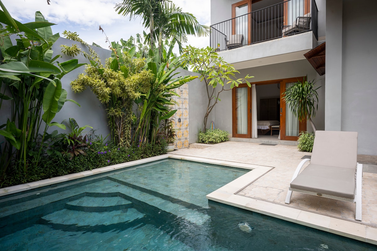 Warm wood. An open courtyard. A two-bedroom villa shaped around a central pool, where every space turns inward and distractions stay outside. Mornings feel unhurried, afternoons stay shaded, and evenings settle naturally as the light softens across the courtyard. Located in Kerobokan between Seminyak and Canggu, cafés and beaches are around 10–15 minutes away by scooter. And once you are back, everything stays quietly centered.