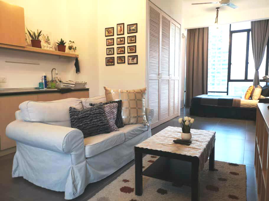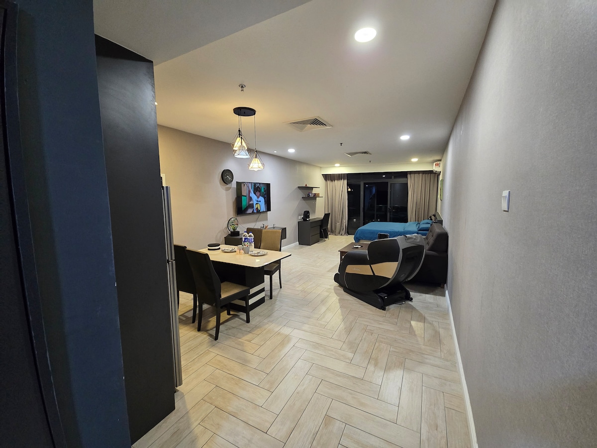 ✨ Brand New Studio at MOSSAZ – Sky Pool, Netflix, Ample Parking & WiFi! ✨ Stay in our brand-new studio condo (344 sq ft) at MOSSAZ! Perfect for couples or small groups. Features: Queen bed + Sofa bed (blanket is not provided for the sofa bed) Compact kitchenette (microwave, no stove) 43" SMART TV with Netflix 100 Mbps WiFi Stunning infinity pool (39th floor) Near One Utama Mall Quiet, cozy, and budget-friendly! No smoking/pets. Quiet hours: 10 PM–9 AM. Book now! 🌟