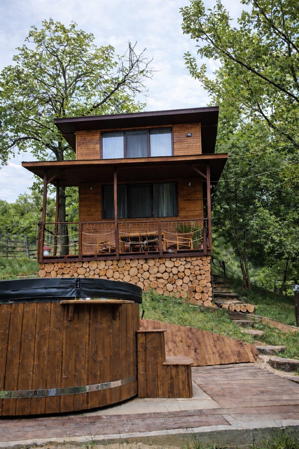 Vă punem la dispoziție o cabană complet utilată și atent amenajată cu 2 camere spațioase, fiecare cu baie proprie și pat matrimonial confortabil. Unul dintre dormitoare include și o canapea extensibila Cadă freestanding Living generos cu canapea extensibila Bucătărie complet utilată Șemineu Jacuzzi nu este inclus în preț ! Videoproiector Masaj relaxare contracost Foișor dotat cu grătar și rotisor Zonă de relaxare cu pat suspendat, șezlonguri Fire Pit Capacitate: 4–8 persoane