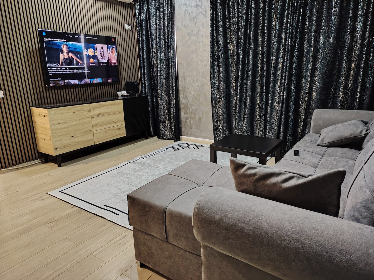 Enjoy a stylish experience at this centrally located residence in Militari Residence. This apartment features the following amenities: Private parking with a barrier Walls decorated with Stucco Veneziano 4K Smart TV with Netflix and Air conditioning The complex offers: indoor and outdoor pools, wet and dry saunas, jacuzzi, and a fitness center. The distance to the Wellness center is 500m, and to Aqua Garden it's 550m, approximately a 7-minute walk. The price for pool access is 70 RON per person.