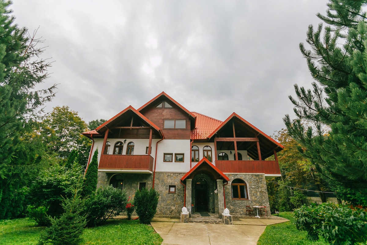 Pension-Bar-Restaurant Busteni. The location is located in the center of Busteni, one of the resorts in Valea Prahova with the most beautiful mountain view. The guesthouse has rooms with bathroom and TV, as well as a spacious bar and restaurant. The ski slope Kalinderu is 1.7 km from the guesthouse, and Sinaia (Dracula Castle) is 7 minutes away by car (8 km). Pensiune-Bar-Restaurant Busteni. Locatie centrala, camere cu baie si TV. Partia Kalinderu este la 1,7 km de pensiune.