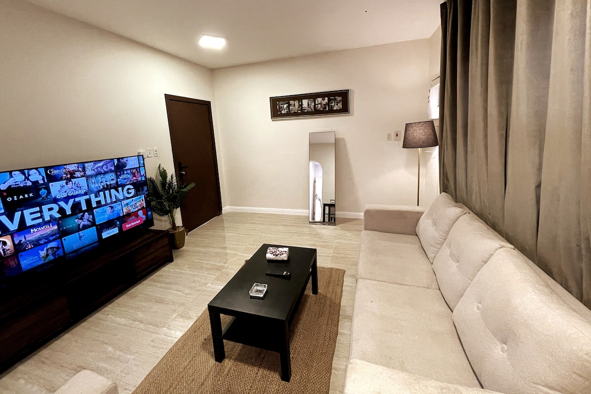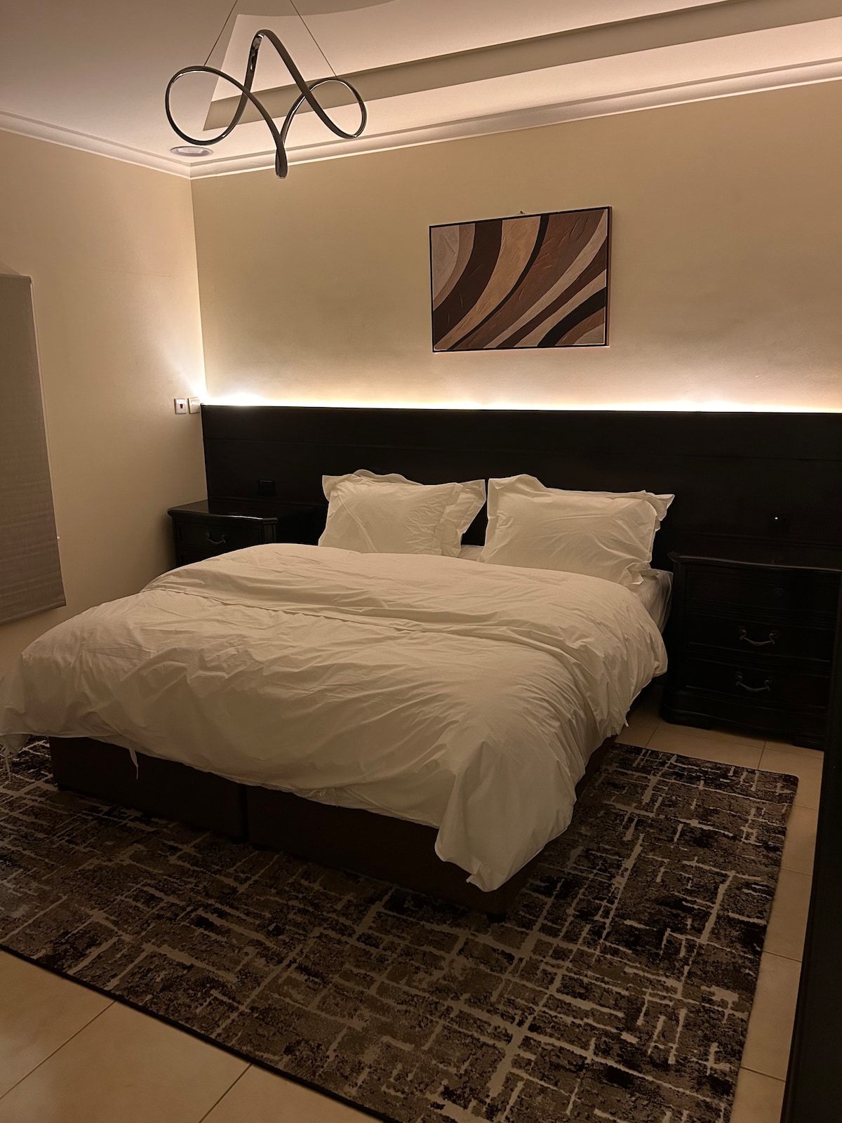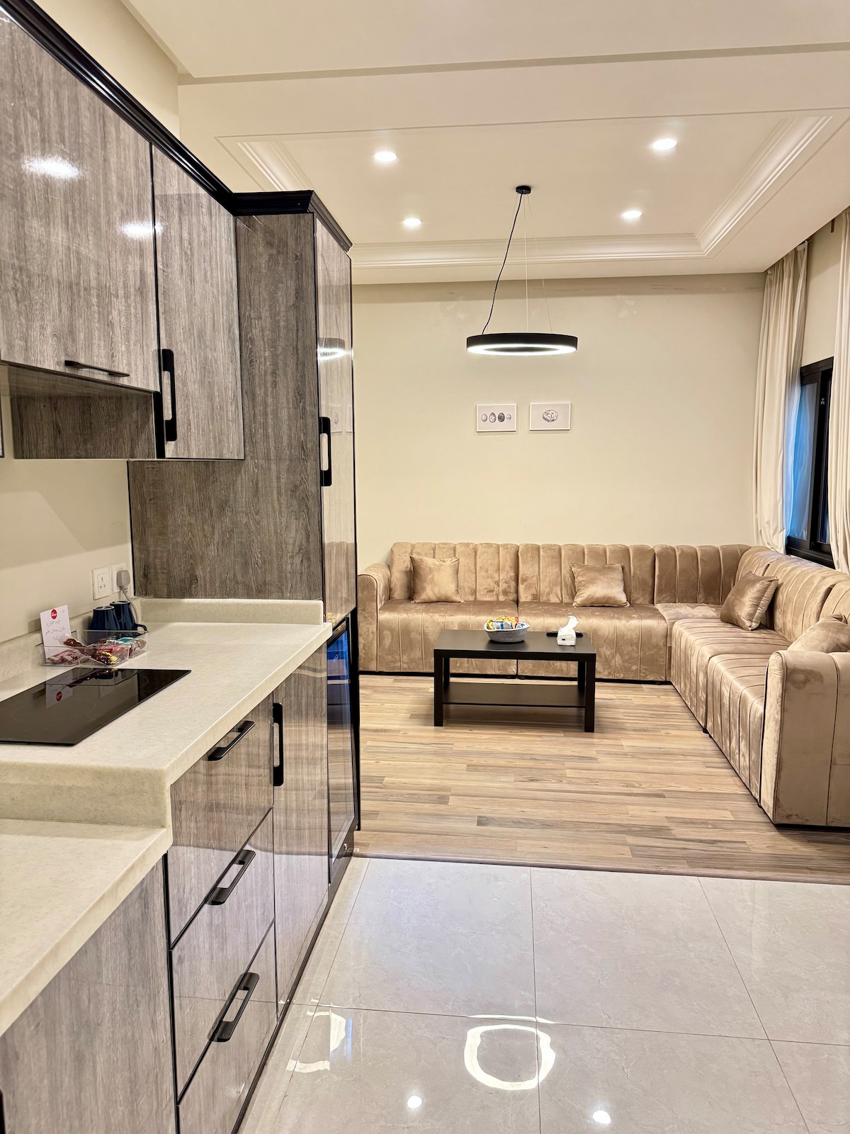 Enjoy a luxury stay in this cozy one-bedroom apartment with a stylish living room, bathroom, and a fully equipped kitchenette. Stay connected with free WiFi and unwind with Netflix and Shahid. The bedroom features a comfortable bed and wardrobe for storage. Located in a prime area, it’s perfect for relaxation and convenience. Whether you're visiting for business or leisure, this modern space offers everything you need for a comfortable and enjoyable stay.