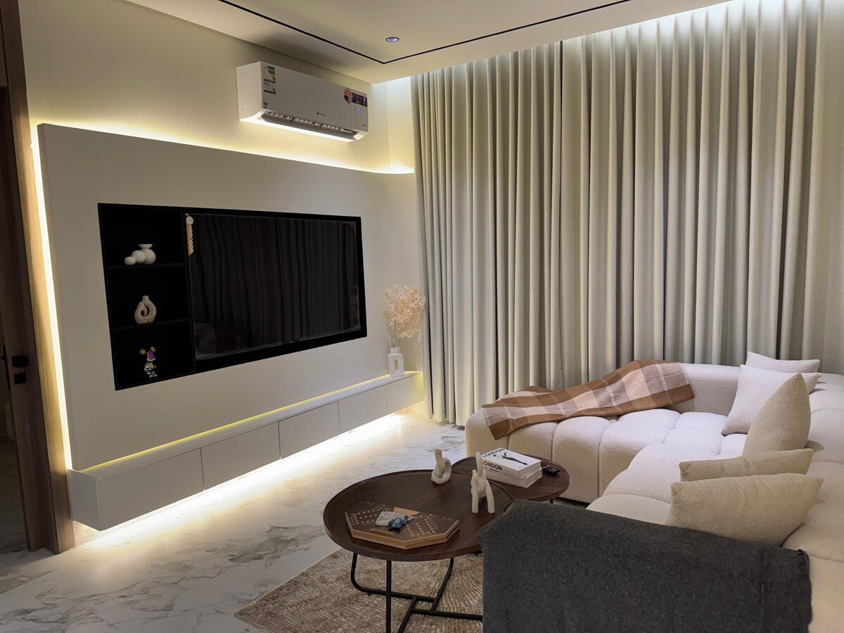 شقة أنيقة مكونة من غرفة وصالة، مناسبة للإقامات القصيرة أو الطويلة، تجمع بين الراحة والتقنية الحديثة. 📺 شاشة 70 بوصة ذكية مع اشتراك OSN . 🍳 ركن مطبخ متكامل يحتوي على ثلاجة، ميكروويف، غلاية، موقد كهربائي. 🔐 دخول ذكي باستخدام قفل إلكتروني لتسهيل الوصول الذاتي بأمان. 🪟 بلكونة خاصة لكل غرفة تمنحك مساحة خارجية خاصة ومريحة. 🕒 مراعاة للهدوء أوقات الراحة من 10:30 مساءً حتى 7:30 صباحاً – نرجو عدم الإزعاج خلالها. 📶 مزايا إضافية: • تكييف سبليت • إنترنت واي فاي • مفروشات نظيفة وعصرية