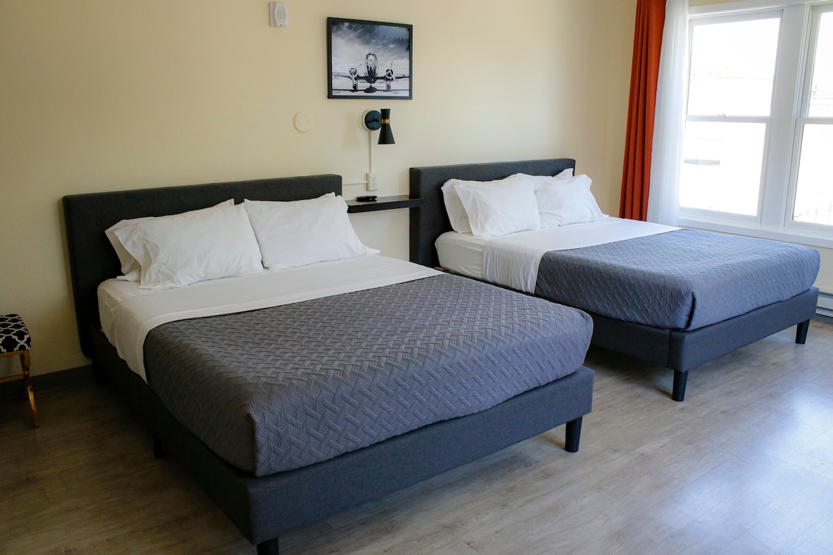 This room has two queen beds, a private bathroom with a shower, and a workspace. Appliances: Fridge, Microwave, Coffee Pot (included: coffee grounds, coffee creamer, disposable coffee cups, sugar packets, assortment of tea bags.).