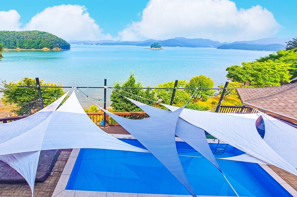 전망 좋은 바닷가 언덕 위 미술관 닮은 단독 별장입니다. 고급 지며 세련됐습니다. 230평 대지에 본 채 외 부속 편의 시설인 건물 3동 포함 80평의 공간입니다. 최고급 자재로 정갈하게 지어진 TV속 보던 별장 식 펜션 입니다. 언제나 청결한 흰색 침구와 화장실은 기본이며 본체 외 넓은 정원과 수영장, 카페겸 식당, 유리 온실 같은 바베큐장이 준비 되어 있고 별도의 비용 지불 시 독립 공간인 뜨끈한 구들동이 있습니다. 이곳은 장작을 지펴 구들을 뜨겁게 데우는 준 한옥식 별채입니다 옥상은 넓고 바다를 품을 수 있게 탁 트여 있습니다.걸어 5분 거리에 예쁘고 한적한 해변이 있고 물이 빠지면 조개잡이 체험 가능합니다. 본체 거실엔 최고급 벽난로가 준비되어 있어 환상적인 불꽃을 보실 수 있고 카페에도 작은 벽난로가 설치되어 밤새 불멍을 즐기실 수 있습니다 내, 외부에는 12이상 즐기실 수 있는 바베큐장과 모닥불을 지피실 수 있는 넓은 정원이 있습니다