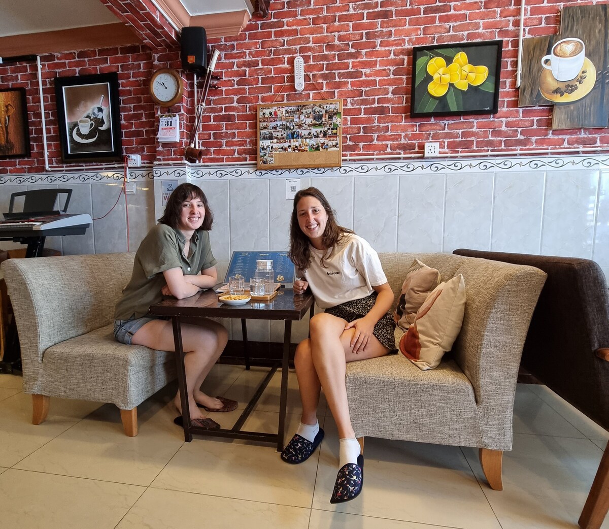 - Bedroom with air-conditioner, standing fan, two double size mattresses, pillows, blankets, wardrobe, television, working desk and chair and two sitting chairs.