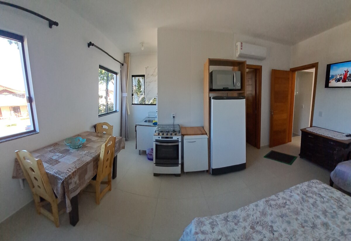 Na praia da Daniela, Estudio/Apartamento independente da casa principal, com todas as comodidades, no norte da Ilha de Florianopolis, à 4 quilômetros de Jurerê Internacional e a 200m da praia. Perfeito para casais, possui cozinha integrada completa com louças, panelas e talheres, forno elétrico, microondas, geladeira, fogão, ar condicionado, Smart TV e internet WiFi. Possui 1 banheiro, 1 cama de casal, armário para roupas, varanda privativa. Acesso a ducha externa. O acesso é independente.