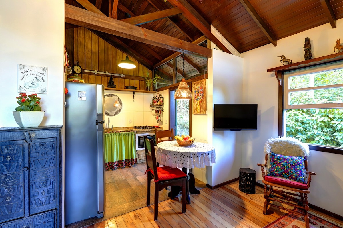 A Rustic Cottage in front of the Conceição Lagoon, surrounded by Native Forest, with a Crystal Water Stream to bathe, a heated Jacuzzi with spring water, sacred fire to warm the nights and an incredible garden to sunbathe or meditate. It is a chalet of great comfort and also privacy. Ideal for couples looking to celebrate love, friends looking to get together and enjoy nature, families who want peace and quiet, or writers and artists looking for inspiration.