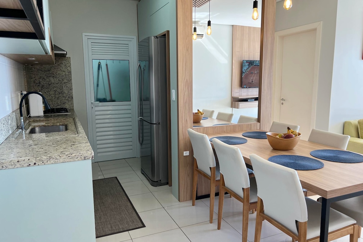 • Acomoda até 8 pessoas; • 3 quartos (uma suíte com cama queen size); • Cozinha completa; • Ar condicionado quente e frio em todos os quartos e sala de estar; • Máquina lava e seca; • Internet rápida; • Smart Tv 40" e canais por assinatura Claro/NET. • Berço (solicite previamente); • Portão automatizado e com no-break; • Próxima à Praia da Daniela; • Bairro tranquilo e seguro; Quartos e camas são disponibilizados conforme a quantidade de hóspedes informados na reserva.