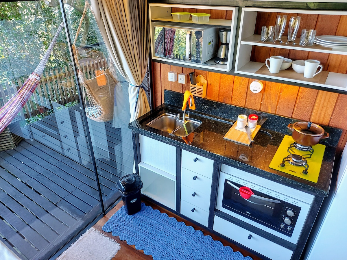 Cabana estilo TreeHouse, vista panorâmica, cercado por natureza é o diferencial desta exclusiva cabana! Com uma varanda acima da linha das arvores voce tera uma vista paradisíaca do oceano, mata nativa, canal cristalina e um vilarejo simpático de pescadores. Não a acesso a carros no morro, tornando se um lugar perfeito para amantes da natureza, aventureiros e quem ama praticar trilhas e esportes aquáticos. Localizado 15 minutos a pé da praia, estacionamentos, restaurantes e transporte público.