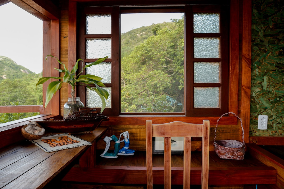 Cabana estilo TreeHouse, vista panorâmica, cercado por natureza é o diferencial desta exclusiva cabana! Com uma varanda acima da linha das arvores voce tera uma vista paradisíaca do oceano, mata nativa, canal cristalina e um vilarejo simpático de pescadores. Não a acesso a carros no morro, tornando se um lugar perfeito para amantes da natureza, aventureiros e quem ama praticar trilhas e esportes aquáticos. Localizado 15 minutos a pé da praia, estacionamentos, restaurantes e transporte público.