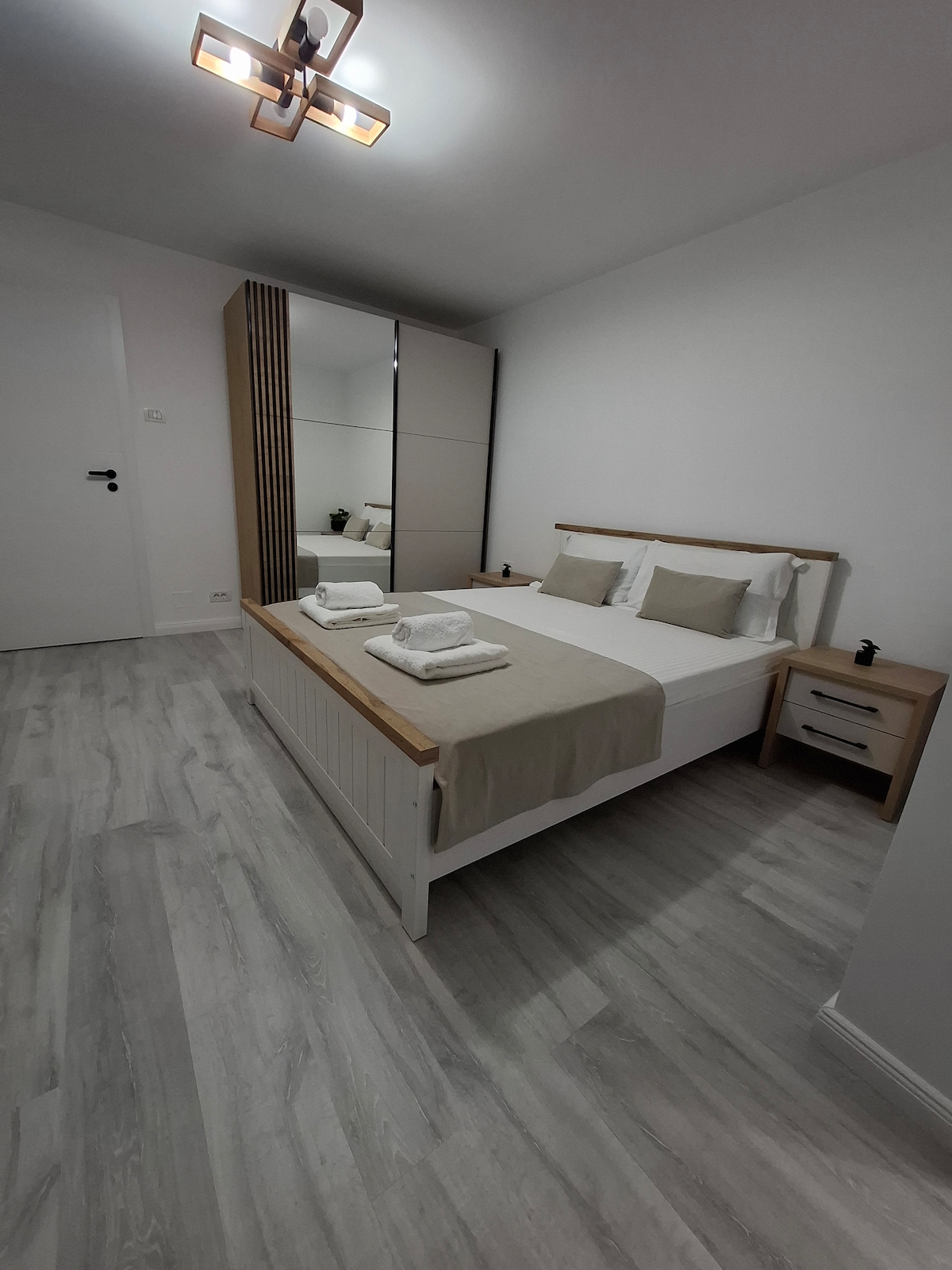 A welcoming atmosphere, in a very quiet area close to the city center. New furniture, fitted kitchen (stove, hood, fridge, dishwasher, dishes and cutlery) no microwave, washing machine, air conditioning, smart TV with Netflix, high-speed Wi-Fi internet. One bedroom with a double bed and one bedroom with a single double bed (can be unfolded and turned into two single beds), bed linens and towels included. Free parking on the street. Grocery store în front of the building.