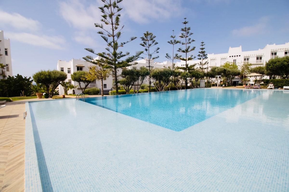Un superbe appartement en Rez de chaussée très spacieux offrant une vue imprenable sur la piscine et sur la mer. Vous y trouverez tout ce qu’il vous fait pour un confort absolu lors de votre séjour. La chambre parentale et le salon donnent sur la piscine et offre une vue sur mer à couper la souffle. La terrasse est entièrement meublée pour un séjour tout confort. La cuisine est équipée de tous les ustensiles de cuisine. Destiné aux touristes étrangers, familles, et couples marocains mariés.