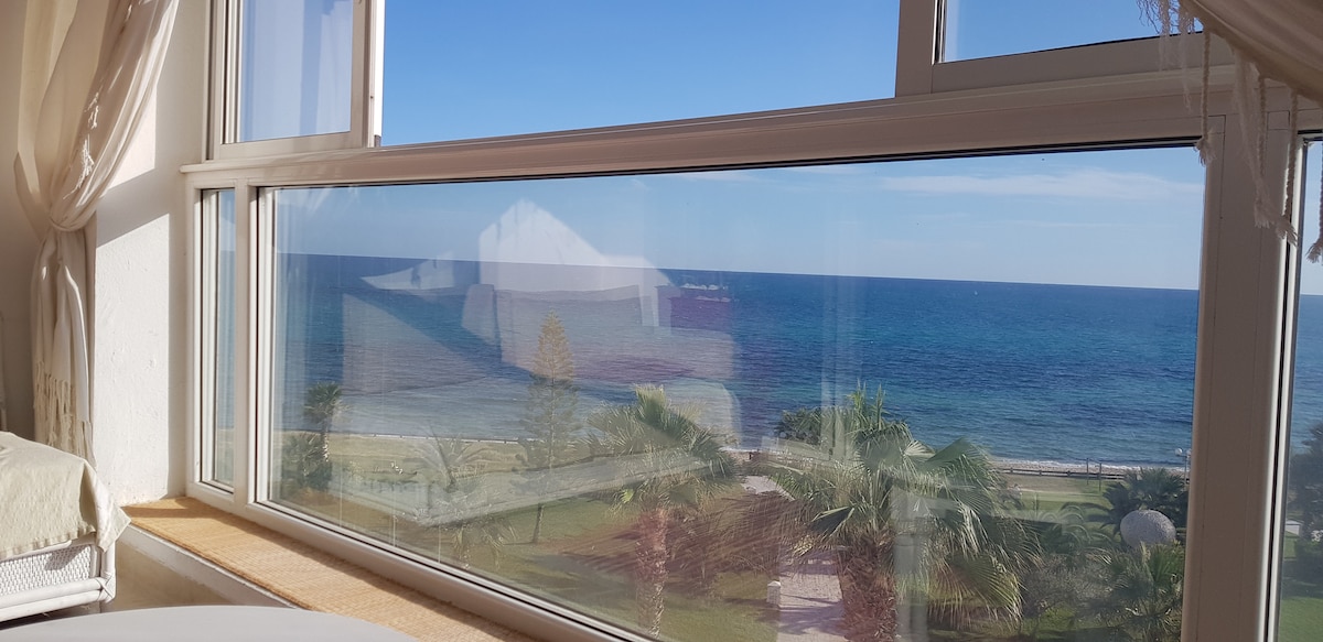 Bonjour Bonjour ! Je vous propose pour vos vacances en bord de mer cet havre de paix en plein cœur de hammamet :-) Idéalement situé, dans la zone touristique Hammamet nord, la résidence côte d'azur en bord de mer entourée de verdure et ayant un accès direct à une plage privée et aménagée . Cet appartement est très bien équipé, dotant d’une magnifique vue sur mer .