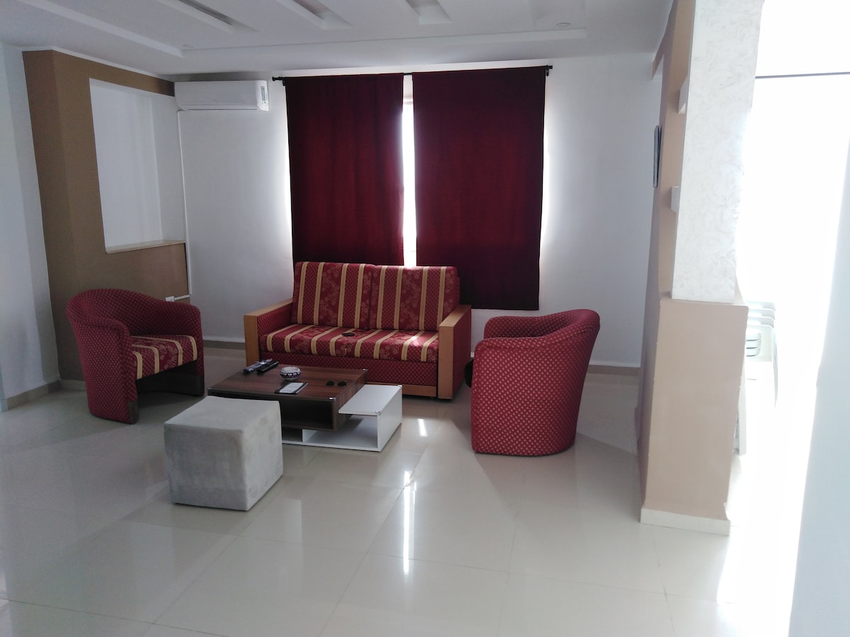 un très joli studio avec une chambre a couché doté d'un grand lit ,un grand salon et salle a manger ,un coin télévision écran plat LED (43 pouces),une cuisine et salle de bain avec douche .au 1er étage de la résidence FAMILIALE