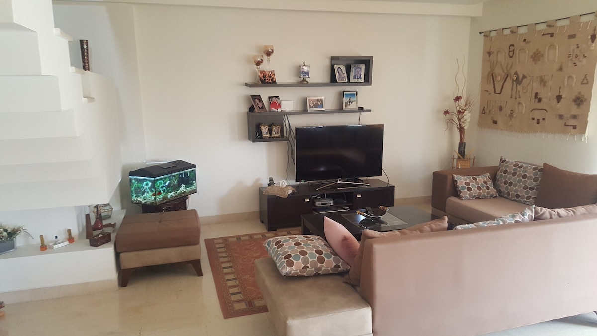 un très joli studio avec une chambre a couché doté d'un grand lit ,un grand salon et salle a manger ,un coin télévision écran plat LED (43 pouces),une cuisine et salle de bain avec douche .au 1er étage de la résidence FAMILIALE