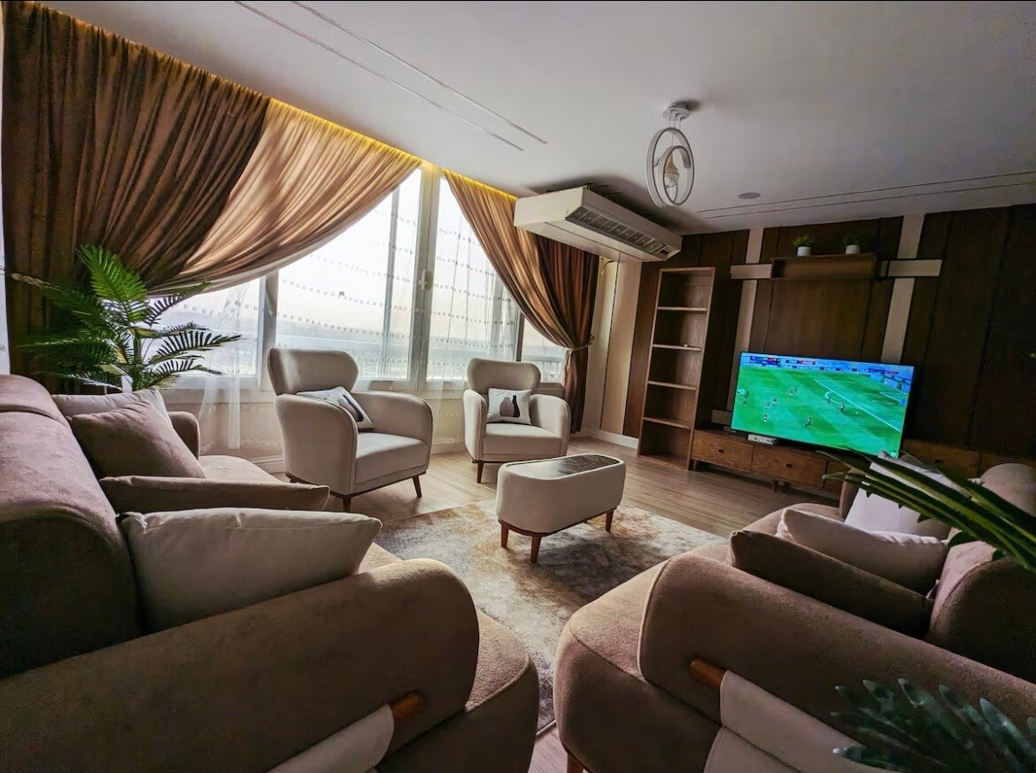 Experience Cairo from above in this spacious 5-bedroom luxury apartment on Maadi Corniche. Enjoy panoramic Nile views and rare distant views of all 6 Pyramids. Bright living areas, a fully equipped modern kitchen, and 4.5 bathrooms make it ideal for families and groups. Quiet, elegant, and minutes from Maadi’s cafés and attractions. Free airport transfer included for all bookings.