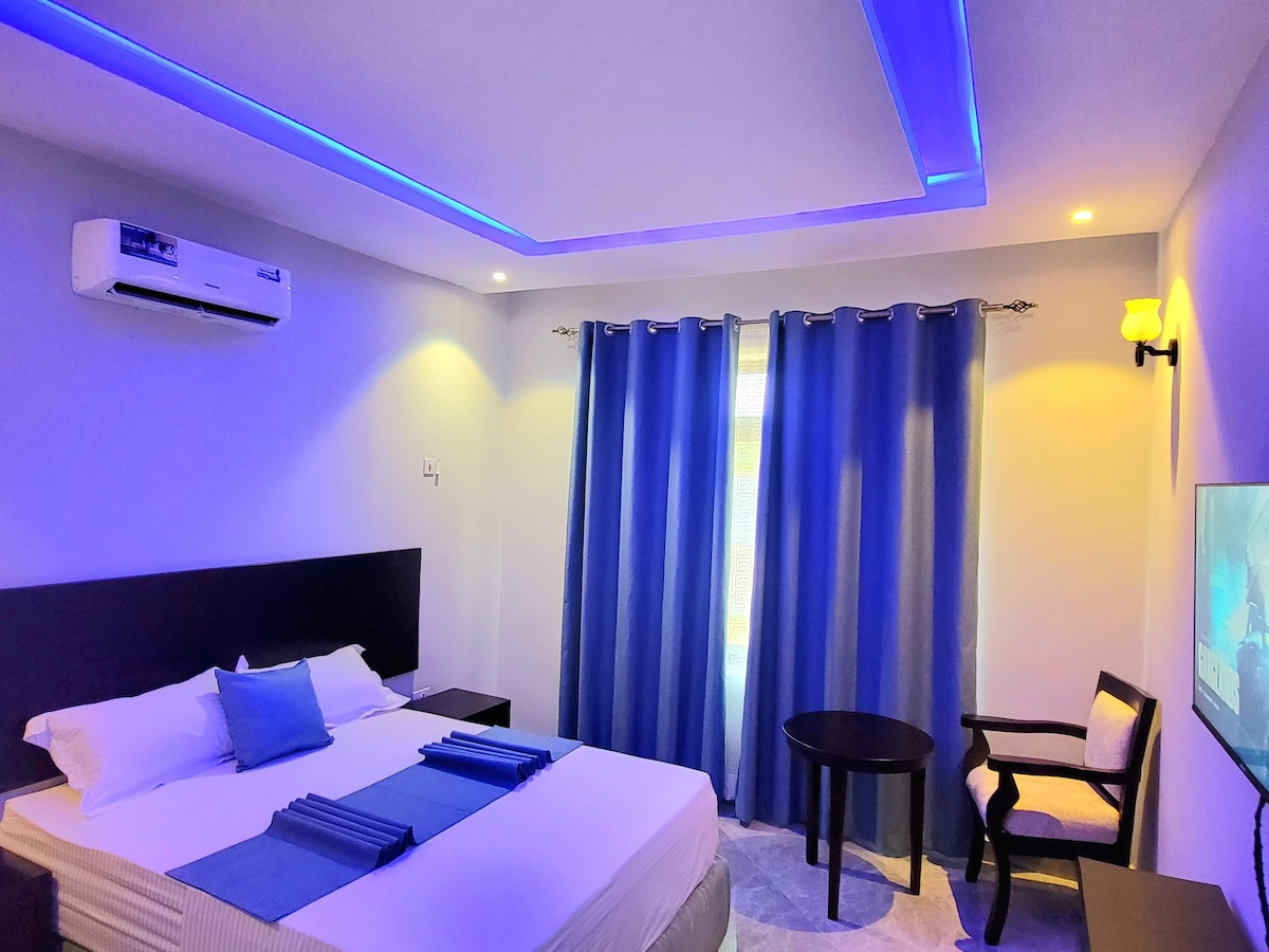 Well lit, very clean newly furnished hotel room, very large, complete with a queen size bed, coffee/tea maker, clean sheets, TV with local channel and DSTV access, very spacious bathroom with all equipments from toothbrush, soap, shampoo, hair dryer, clean towels, also a big couch and study table.
