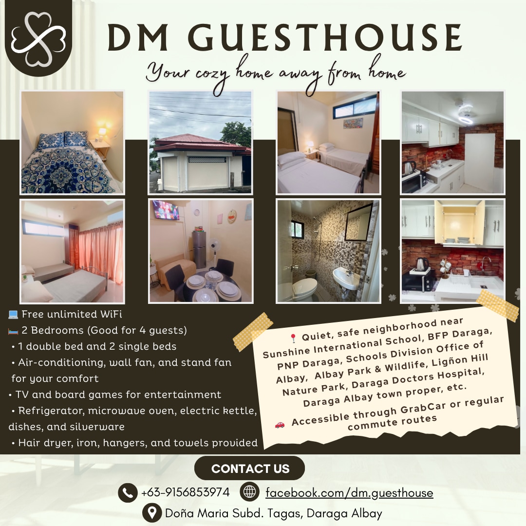 Welcome to our cozy guest house in Daraga, Albay! Peaceful and budget-friendly, it accommodates 4 people (extra guests allowed with an additional charge). A bakery is right next door, while cafés, grocery stores, and laundry services are all nearby. With easy GrabCar access, you're just minutes away from Mayon Volcano, Cagsawa Ruins, and the best of Albay. Perfect for families, groups, students, and backpackers alike! We also offer breakfast options for an added cost — simply order in advance