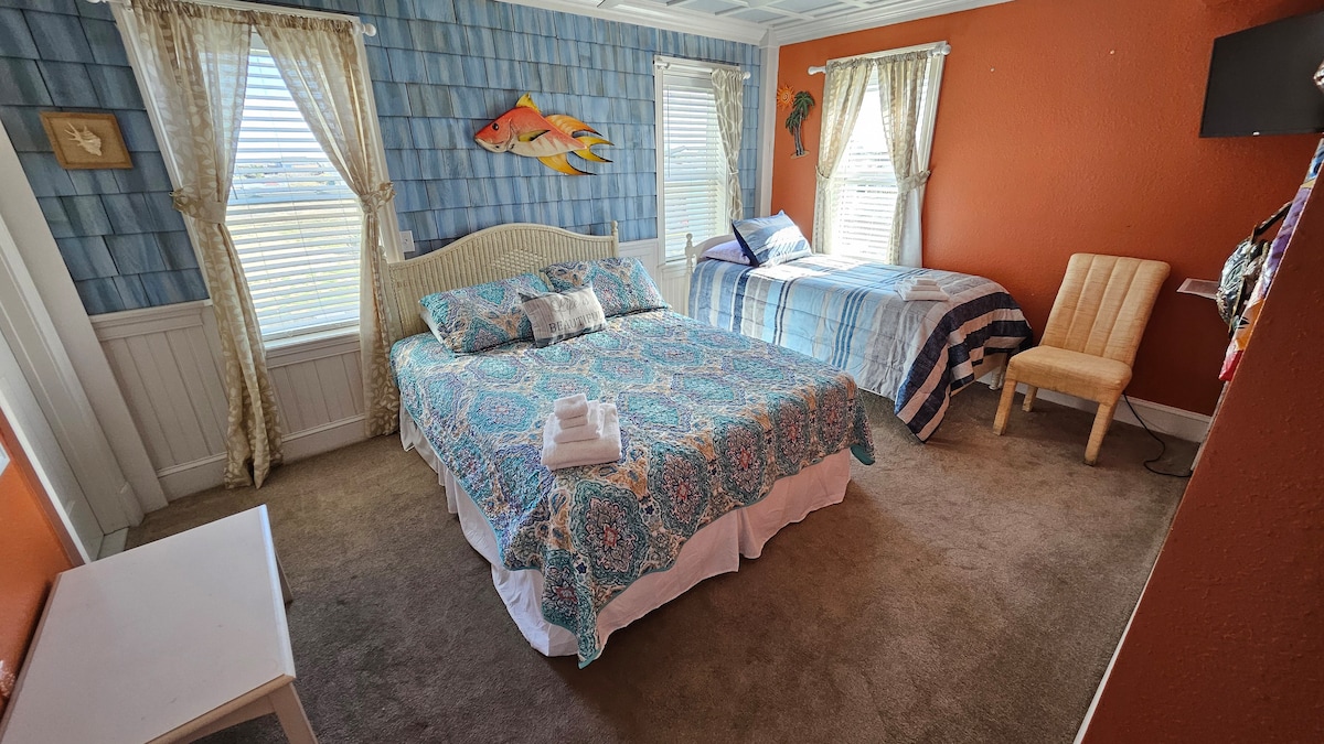 Licensed B&B w/ Pool on Beach Road Pier View has 2 queen beds, sitting area, large deck with ocean view, private bathroom w/ jetted tub and separate shower, Roku Smart TV and free WiFi. Shared B&B kitchenette and sitting area downstairs, enjoy snacks, and a light continental breakfast each morning. House has a private pool for guests and is a very short walk to beach. We are pet friendly!