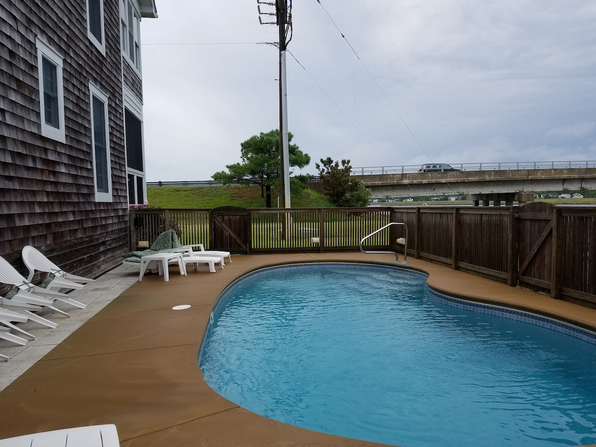 This accommodation offers the upstairs of a private home consisting of 2 beautiful bedrooms and a private bath shared by these 2 bedrooms. It is on a lovely, quiet, treed street in a very upscale Kitty Hawk neighborhood. Guests will have access to private pool, deck, private outdoor shower with toilet, laundry room, Kitchen/Dining area for self-prepared meals --storage in garage. Easy walk to the beach in 10 minutes or drive in 2 minutes & park in community parking right at beach access.