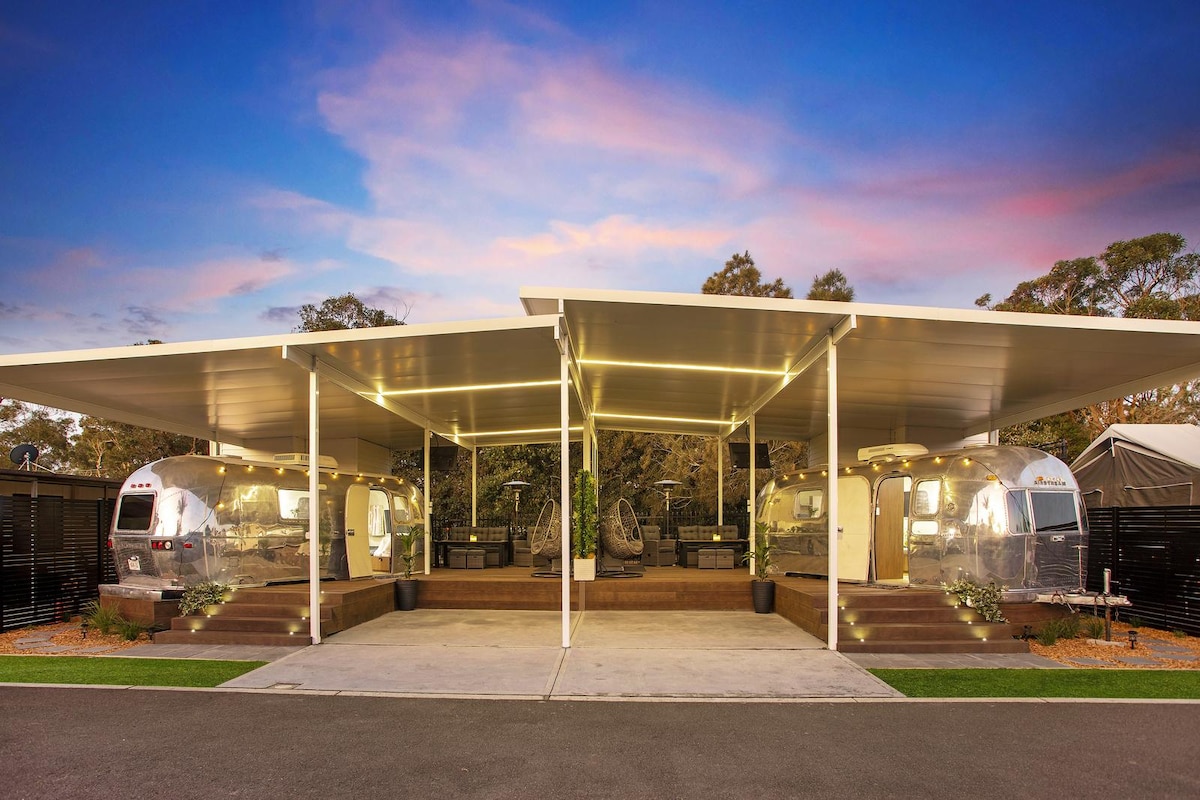 If you’re looking for a unique accommodation option you can’t go past our iconic 1970s air streams. They have been retro fitted with all modern amenities, offering the very best of both worlds with indoor and outdoor living areas. Inside the air-conditioned caravan, you will comfortably sleep 2 adults on a custom double bed and 2 children in the bunk beds. Pool, Jumping pad, playground, games room as shared facilities.