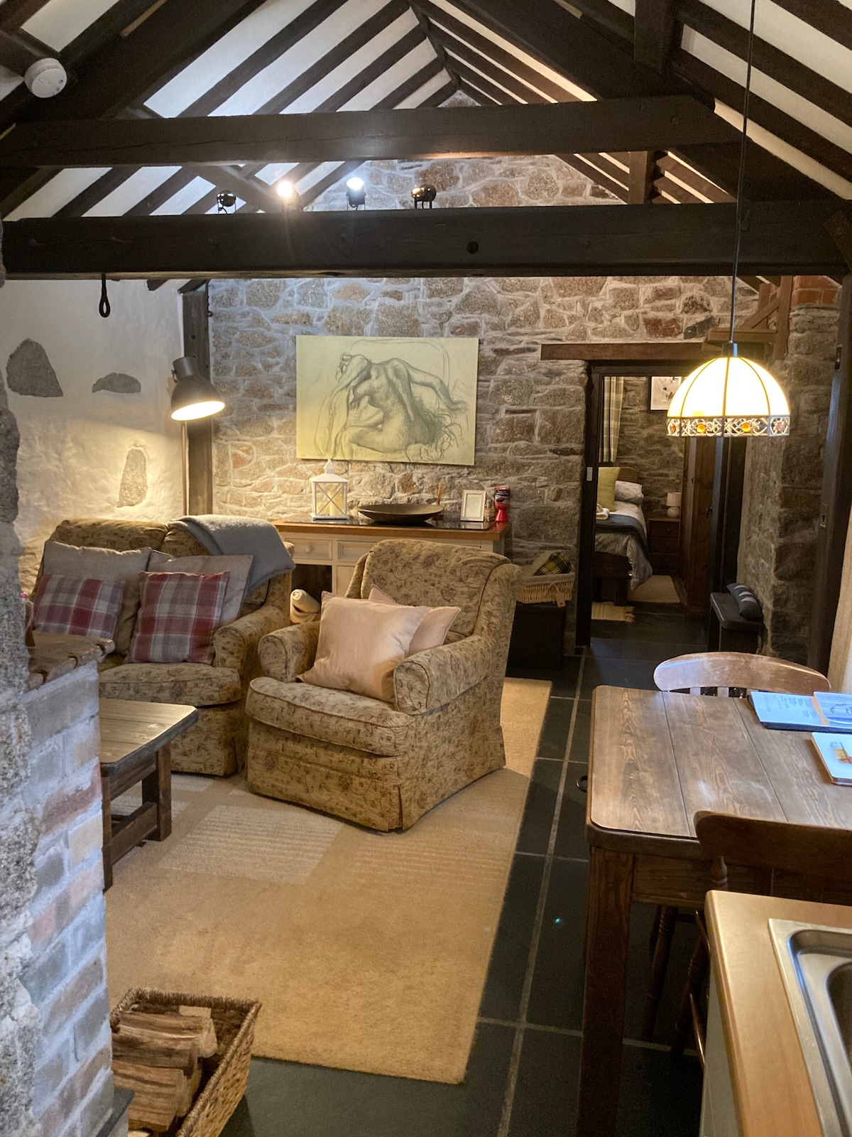 North Barn is an 18th century stone building, bursting with character, set on the banks of the River Dart. Originally a corn collection point, North Barn has been renovated to a beautiful, romantic ‘one-room-living’ self-catering space. The atmosphere is fresh and light, with skylights that make even the dullest of days seem bright. The patio doors open up on to a large deck area overlooking the river from an elevated height thus giving you great views across the River Dart.