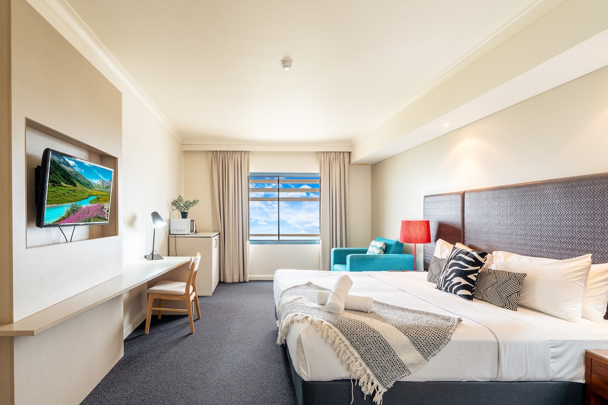 The well-appointed Studio with private balcony is flooded with natural light, and provides a stylish, open-plan space to unwind and relax. Offering a comfortable king bed, apartment-controlled heating/air conditioning, kitchenette with cooktop, bar fridge, toaster, kettle and microwave, ensuite bathroom with amenities and hair dryer, desk, LCD TV with Foxtel and high-speed internet access. A wardrobe, ironing board and iron, and private safe add to the convenience. Guests can access the in-house gym and alfresco BBQ area. A daily housekeeping service is included (excluding Sunday and public holidays).
