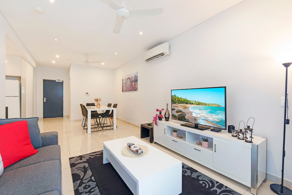101 The Darwin is a relaxed, effortless Waterfront escape. A fully self‑contained 1‑bedroom apartment for two at the iconic Darwin Waterfront. Sink into easy living with a full kitchen, private laundry, free parking, a dedicated workspace and a spacious verandah. Steps from the sea lagoon, wave pool and vibrant dining precinct, with Stokes Hill Wharf and the city’s best cafés, bars and restaurants just a leisurely stroll away.